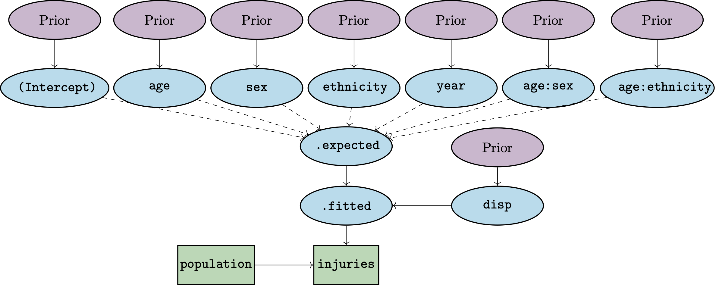 We specify a model where counts of injuries are treated as a random draws from Poisson distributions. The expected number of injuries varies with different combinations of age, sex, ethnicity, and year.