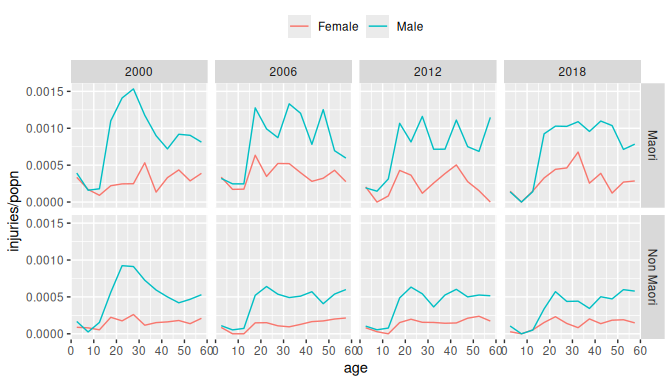 mod <- mod_pois(injuries ~ age * sex + age * ethnicity + year,