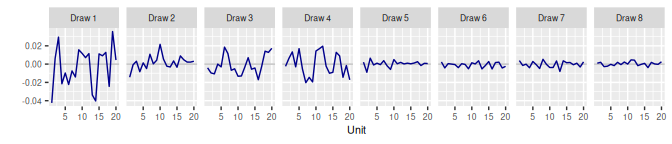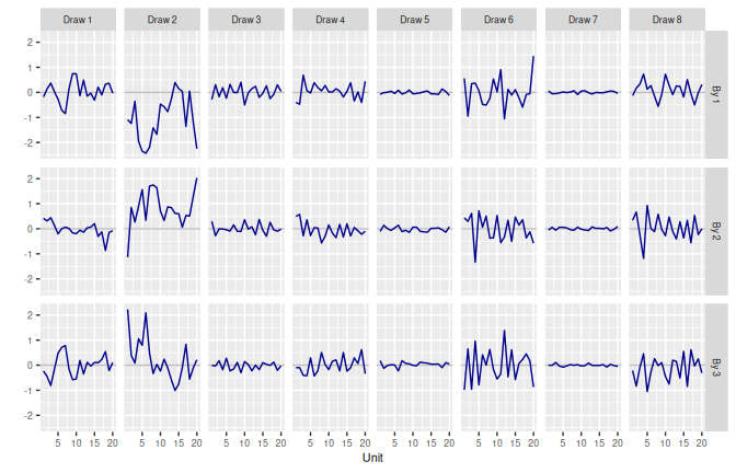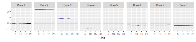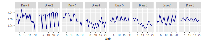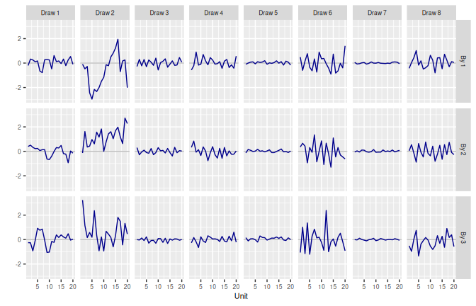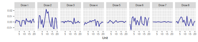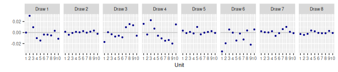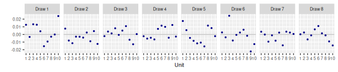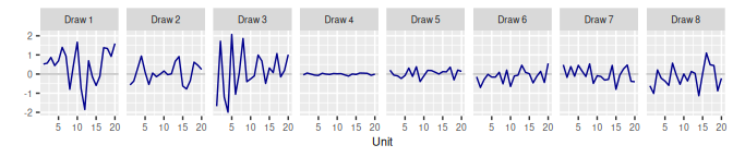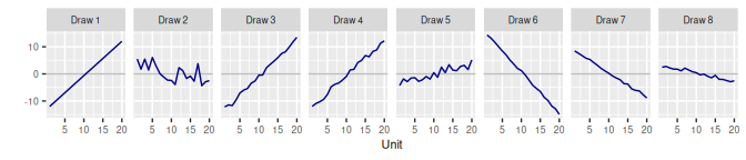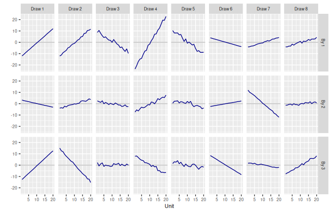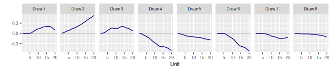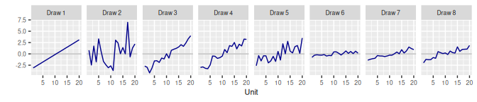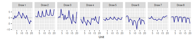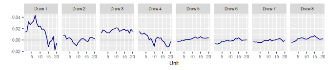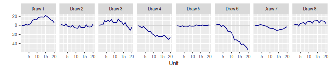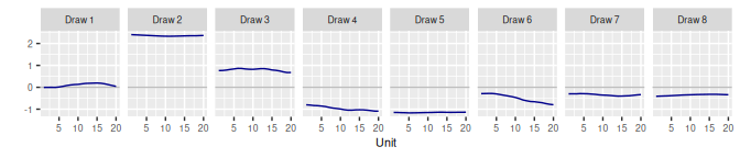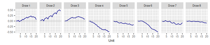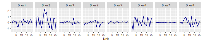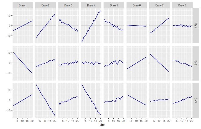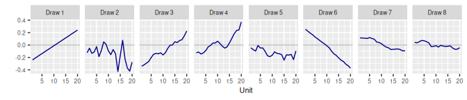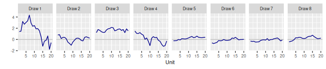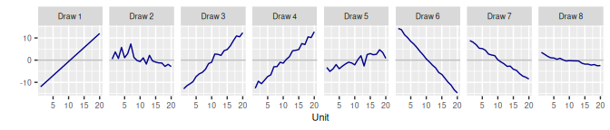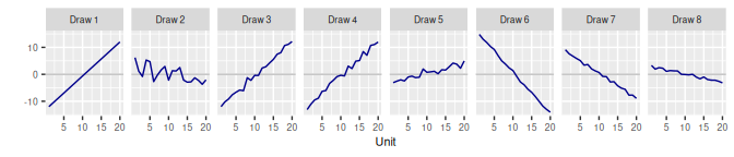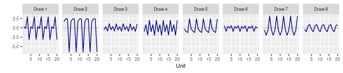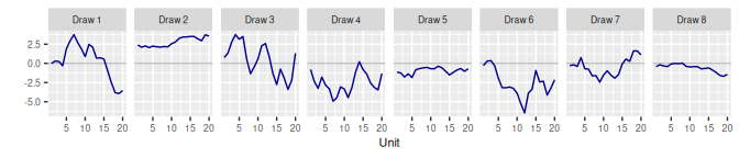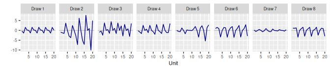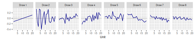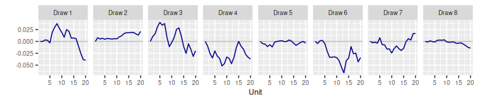 \[\begin{align} \beta_j & = \alpha_j + \epsilon_j \\ \alpha_j & = \left(j - \frac{J + 1}{2}\right) \eta \\ \eta & \sim \text{N}\left(\mathtt{mean\_slope}, \mathtt{sd\_slope}^2 \right) \\ \epsilon_j & \sim \text{N}\left(\phi_1 \epsilon_{j-1} + \cdots + \phi_{\mathtt{n\_coef}} \epsilon_{j-\mathtt{n\_coef}}, \omega^2\right) \tau & \sim \text{N}^+\left(0, \mathtt{s}^2\right) \\ \frac{\phi_k + 1}{2} & \sim \text{Beta}(\mathtt{shape1}, \mathtt{shape2}) \end{align}\]