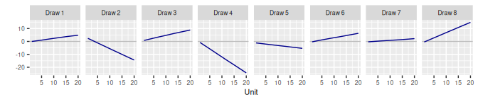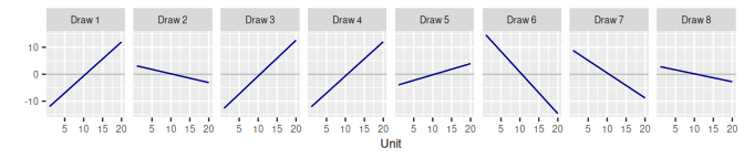 \[\begin{align} \beta_j & = \alpha_j + \epsilon_j \\ \alpha_j & = \left(j - \frac{J + 1}{2}\right) \eta \\ \eta & \sim \text{N}\left(\mathtt{mean\_slope}, \mathtt{sd\_slope}^2 \right) \\ \epsilon & \sim \text{N}(0, \tau^2) \\ \tau & \sim \text{N}^+\left(0, \mathtt{s}^2\right) \end{align}\]