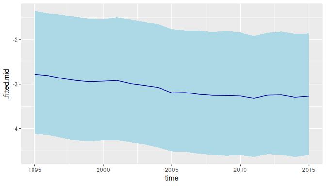 In contrast to the all-defaults model in Chapter 11 of BDEF, the all-defaults model here does not yield exploding prediction intervals.
