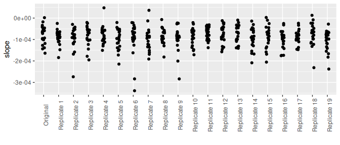 The slopes from the original data (on the far left) have aboout the same level of variability as the slopes from the replicate data. The implication is that, even without a county-time interaction, the model is a satisfactory job of representing cross-county variability in the pace of decline.