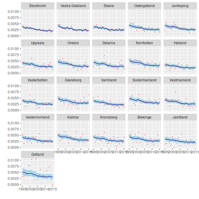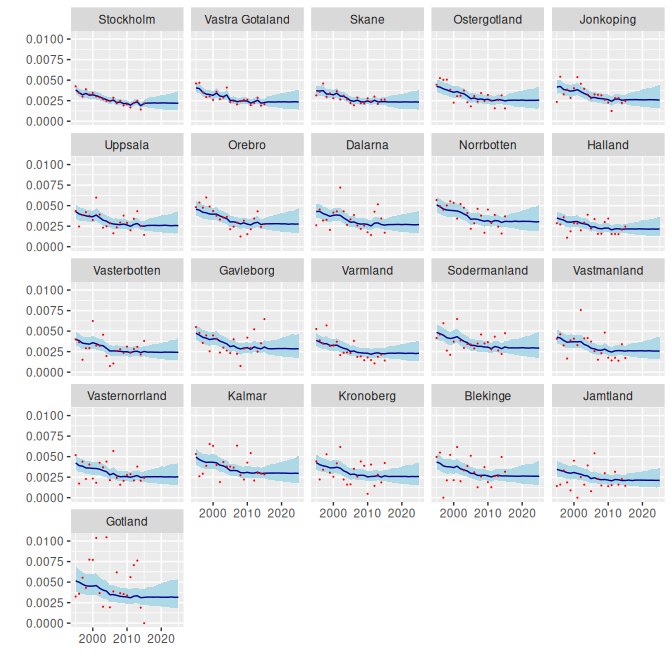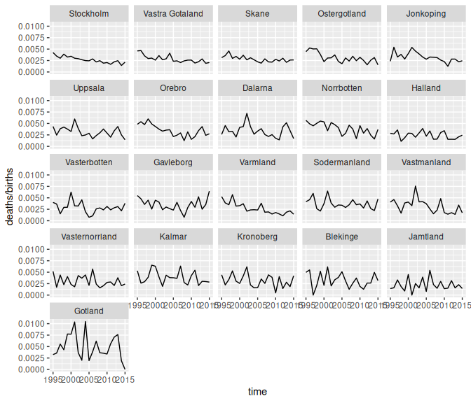 We estimate and forecast infant mortality in Swedish counties. Following standard demographic practice we define the infant mortality rate as the probability of dying during the first year of life, calculated using this year’s infant deaths and this year’s births. (See Chapter 11 of BDEF on why this definition is slightly odd.)