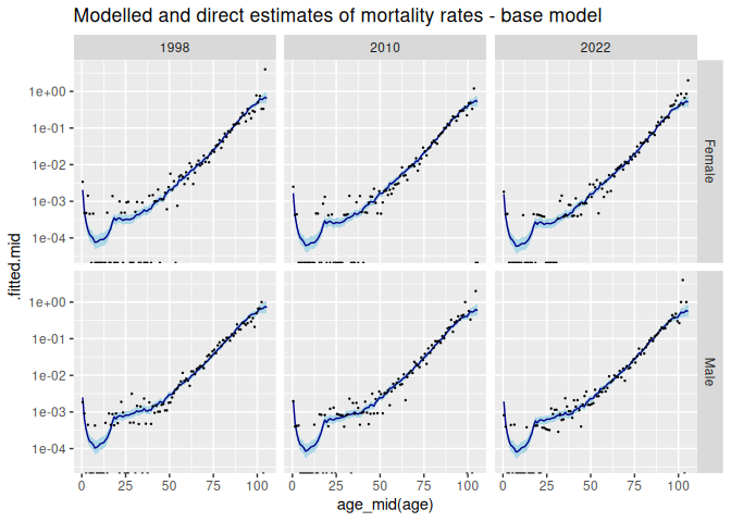 ggtitle("Modelled and direct estimates of mortality rates - base model")