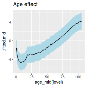 A graph of the age effect reveals a typical profile for mortality rates,