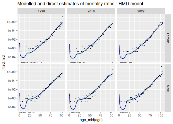 ggtitle("Modelled and direct estimates of mortality rates - HMD model")