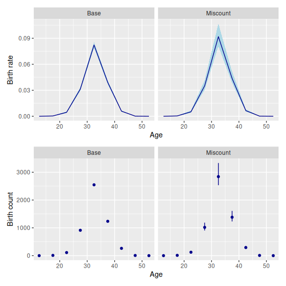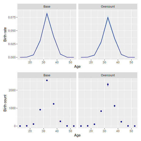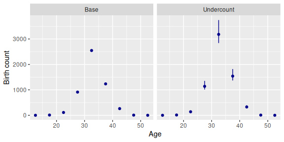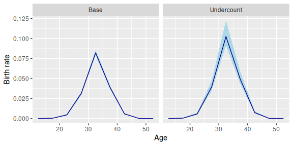 Estimated birth rates from the undercount model are higher than estimated birth rates from the base model, since the undercount model assumes that reported births understate true births.